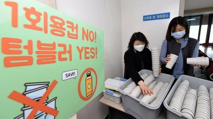 인천시가 1일 친환경 자원순환 청사 현판식을 열고 일회용품 사용·반입 금지 시책을 전면 시행했다. 사진은 일회용 컵 대신 비치된 다회용 컵을 정리하는 인천시청 공무원들.