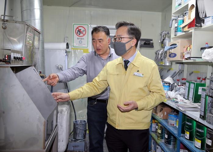 유성훈 금천구청장이 24일 독산1동 미세먼지 집중관리구역내 대기배출사업장 현장점검에 나섰다. 유 구청장은 오후 2시부터 자동차 정비사업소 등이 밀집해 있는 독산1동 미세먼지 집중관리구역내 자동차 도장시설을 둘러보고 현장지도를 실시했다. 사진은 유 구청장이 현장점검을 하고 있는 모습. (사진제공=금천구청)