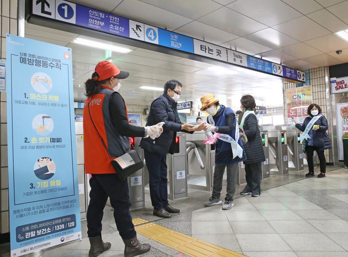 서울 도봉구가 9일 유동인구가 많은 창동역 일대에서 자율방재단과 함께 코로나19 지역사회 감염 차단을 위한 ‘사회적 거리두기 및 예방수칙 홍보 캠페인’과 역사 주변 방역활동을 전개했다. 사진은 주민들에게 홍보물을 나눠주고 있는 모습. (사진제공=도봉구청)