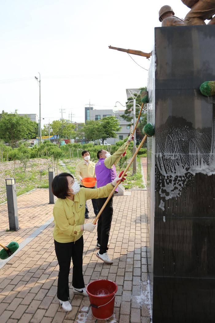 충남 서산시의회가 ‘6월 호국보훈의 달’을 맞아 지난 1일 아침 동문2동 동문근린공원 내 나라사랑공원에서 의미있는 봉사활동을 펼쳤다. 사진은 유공자탑을 청소하고 있는 의원들의 모습. (사진제공=서산시의회)