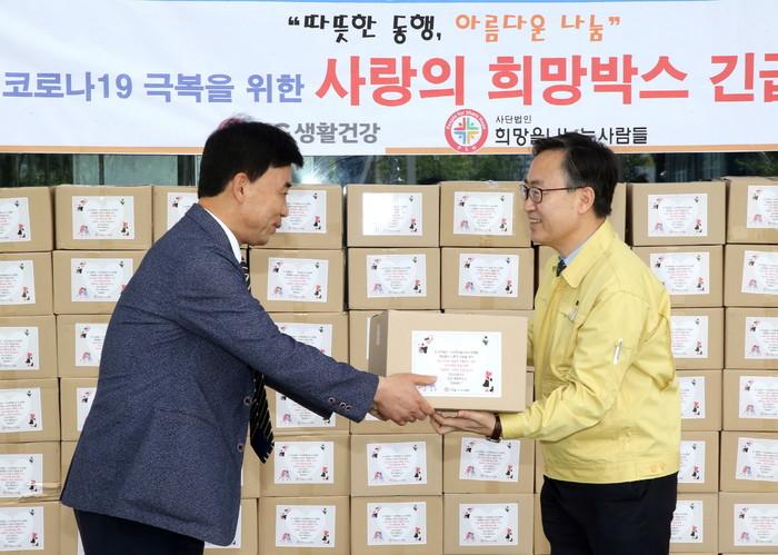 금천구가 최근 (사)희망을나누는사람들로부터 LG생활건강이 후원한 사랑의 희망박스 100상자를 전달받았다. 이날 전달식은 유성훈 구청장과 김정안 (사)희망을나누는사람들 회장이 참석한 가운데 구청 광장에서 진행됐다. 사진은 김 회장이 유 구청장(오른쪽)에게 희망박스를 전달하는 모습. (사진제공=금천구청)