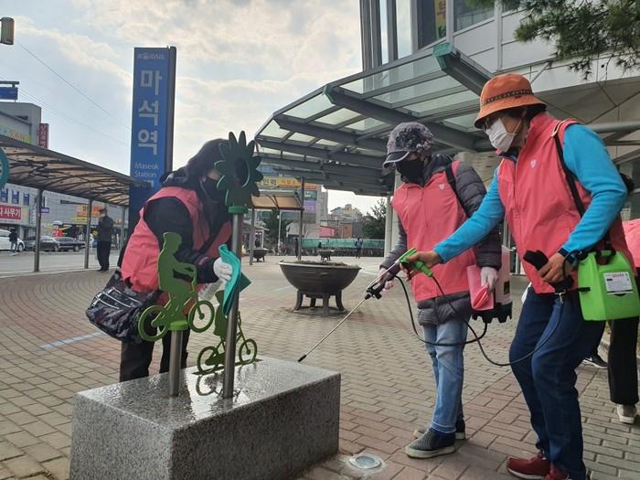 경기 남양주시 여성단체협의회는 최근 코로나19 확산 방지를 위해 마석역을 중심으로 방역작업을 전개했다. 여성단체협의회는 코로나19가 종식될 때까지 매주 금요일 정기적으로 소독할 예정이다. 사진은 역 주변에서 소독을 하고 있는 모습. (사진제공=남양주시청)