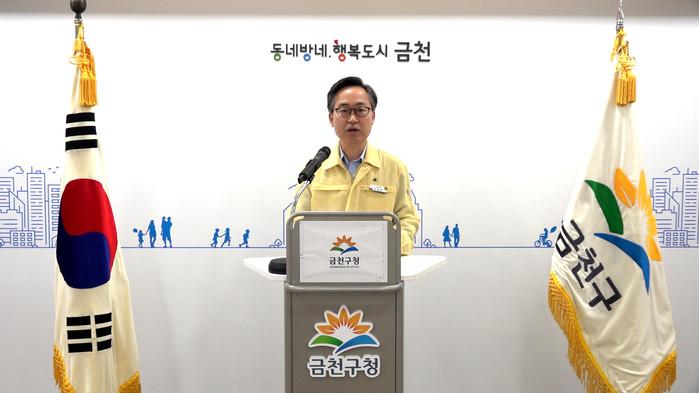 유성훈 서울 금천구청장이 최근 사회적거리두기 강화에 따른 대주민 담화문을 영상을 통해 발표했다. 유 구청장은 성북구 서울사랑제일교회, 광화문 집회 등과 최근 구에서 발생한 축산가공 업체 집단감염과 관련해, 주민들에게 강화된 방역조치사항을 안내했다. 사진은 유 구청장이 구청 소회의실에서 대주민 담화문 발표영상을 촬영하고 있는 모습. (사진제공=금천구청)