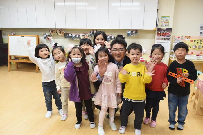 오승록 서울 노원구청장은 13일 ‘2019 구청장과 함께하는 학부모 간담회’를 개최, 지역내 상계3·4동에 위치한 동화나라 유치원 등을 각각 방문했다. 사진은 학부모 간담회에 참석한 오승록 구청장이 유치원 어린이들과 함께 기념촬영을 하는 모습. (사진제공=노원구청)