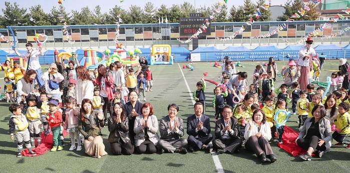 인천 서구가 최근 어린이집 아동 1000여명을 대상으로 '어린이 체험 한마당 축제'를 열고 에어바운스, 터널통과, 롤러코스터 활동, 버나 놀이 등 다양한 야외 체험 프로그램을 진행했다. 사진은 행사에 참석한 이재현 구청장과 아이들의 기념촬영 모습. (사진제공=서구청)