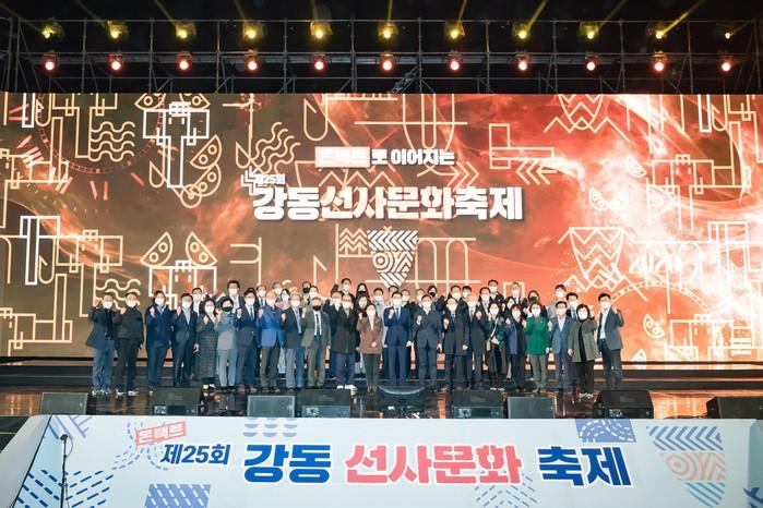 서울 강동구 ‘제25회 강동선사문화축제’가 지난 11일 축제의 하이라이트 ‘이음식’으로 희망과 응원의 메시지를 전달하며 대단원의 막을 내렸다. 사진은 제25회 강동선사문화축제 ‘이음식’에서 관계자들이 단체 기념촬영을 하는 모습. (사진제공=강동구청)