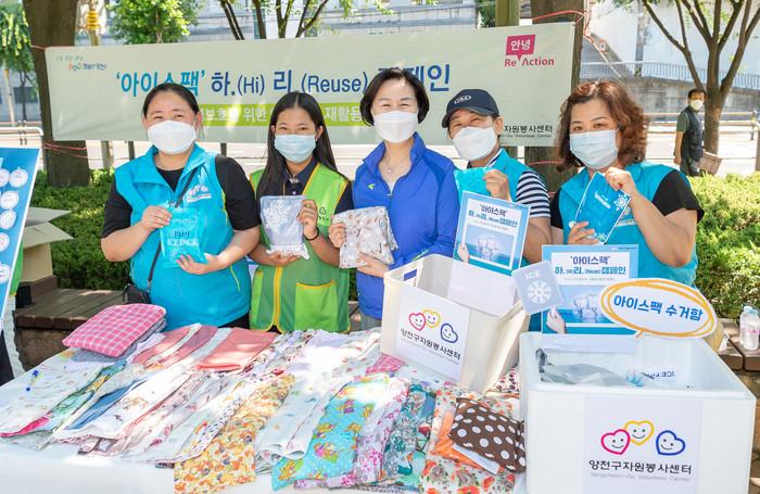 서울 양천구가 최근 버려지는 아이스팩을 주민들이 직접 제작한 아이스 팩 주머니에 넣어 폭염에 취약한 계층에 전달하는 '아이스 팩 하리(Hi, Reuse) 캠페인'을 전개했다. 사진은 김수영 구청장(가운데)이 봉사자들과 기념촬영을 하는 모습. (사진제공=양천구청)