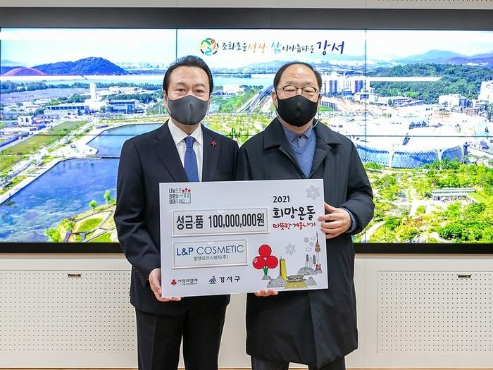 서울 강서구는 22일 엘앤피코스메틱으로부터 1억원 상당의 성금과 성품을 기탁받았다. 이날 기탁된 5000만원 상당의 마스크팩과 성금 5000만원은 서울사회복지공동모금회를 통해 지역내 저소득 주민에게 전달될 예정이다. 사진은 전달식에서 노현송 구청장(왼쪽)과 권오섭 회장이 기념촬영을 하고 있는 모습. (사진제공=강서구청)