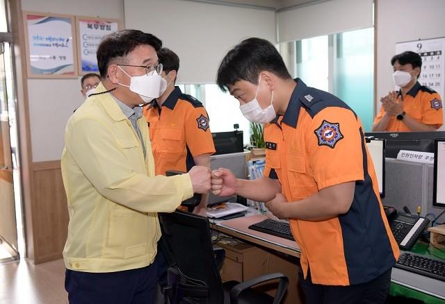 [광주=정찬남 기자] 김종효 광주광역시 행정부시장이 추석 명절을 앞두고 17일 오전 동부소방서를 방문해 현장활동 부서 직원들을 격려하고 추석 연휴에도 시민들의 안전과 재산보호에 최선을 다 해줄 것을 당부했다.