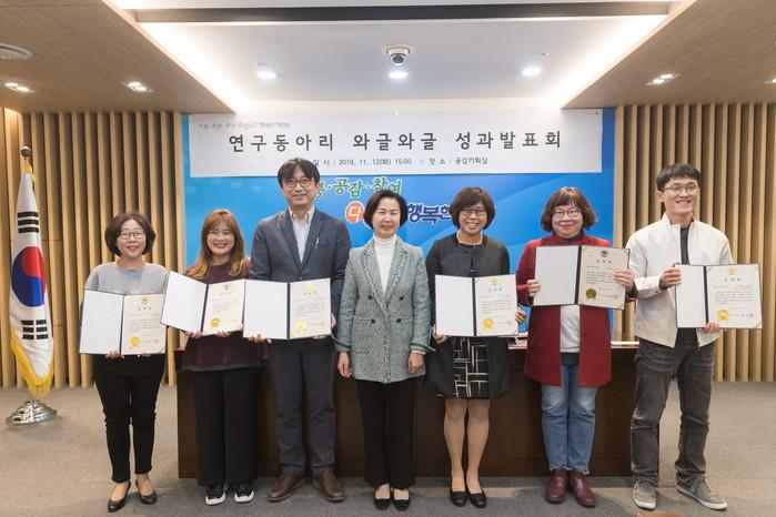 지난 12일 김수영 서울 양천구청장이 구청 공감기획실에서 열린 정책연구동아리 ‘와글와글’ 성과발표회에 참석해 “이번에 제안된 정책이 실제 정책으로 이어지기 위한 노력을 이어가 달라”고 당부했다. 사진은 표창장 수여 후 수여자들과 기념촬영을 하고 있는 김 구청장(가운데)의 모습. (사진제공=양천구청)