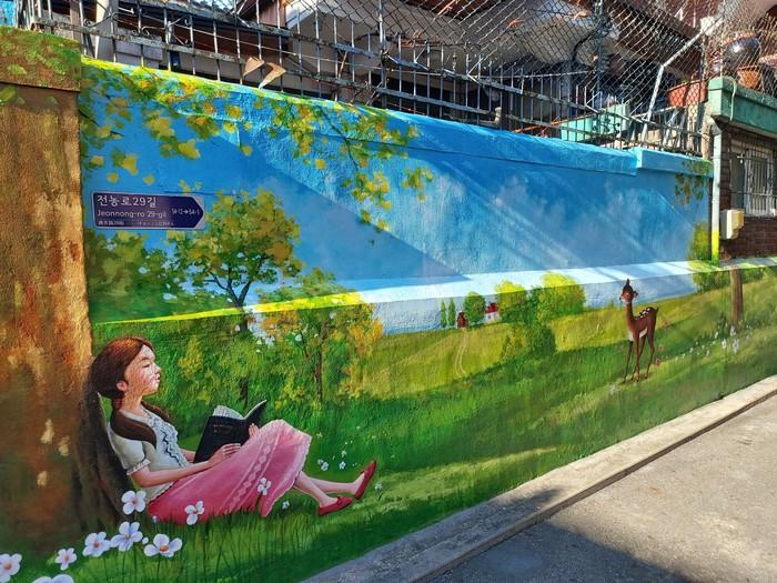 전농1동에 소재한 답십리로23다길 45일대는 주택가 초입의 골목길과 큰 길이 만나는 지점으로 오고가는 주민들이 많지만 노후된 벽화가 골목 일대 도시미관을 저해했다. 이곳은 기존에 설치된 낡은 벽화를 제거하고 푸른 들판에 책 읽는 소녀와 사슴, 꽃 등이 어우러진 벽화를 설치해 분위기를 탈바꿈했다.
