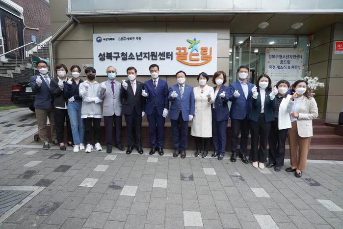 서울 성북구 청소년지원센터 꿈드림이 동선동으로 시설을 이전하고 27일 현판식을 개최했다. 꿈드림은 학교 밖 청소년에게 다양한 경험과 배움의 기회를 제공하기 위해 지하 1층~지상 2층 규모로 동아리 공간, 상담실, 스터디카페 등이 마련됐다. 사진은 현판식에서 이승로 구청장(왼쪽 일곱 번째)이 관계자들과 기념촬영을 하는 모습. (사진제공=성북구청)