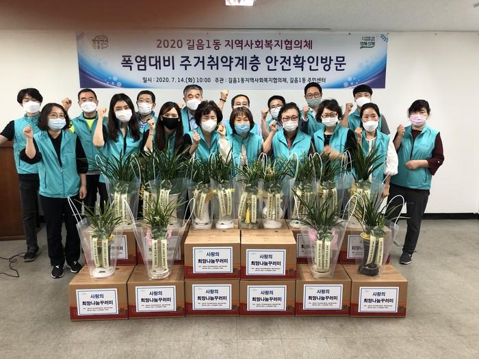 서울 성북구 길음1동 지역사회복지협의체가 지난 14일 소리마을 일대 폭염에 취약한 저소득 노인 20가구를 대상으로 안전확인 방문과 함께 지역 유통업체들이 후원한 보양식품 등이 담긴 여름나기 물품 '사랑의 희망꾸러미'를 전달했다. 사진은 협의체 회원들의 기념촬영 모습. (사진제공=성북구청)