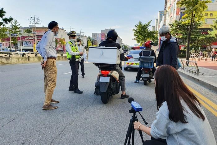 경기 수원시 장안구는 소음공해에 따른 주민불편을 해소하기 위해 이달부터 두 달간 수원중부경찰서·한국교통안전공단과 함께 이륜차 합동단속을 추진한다. 사진은 최근 관계자들이 이륜차 배기소음을 측정하고 있는 모습. (사진제공=장안구청)