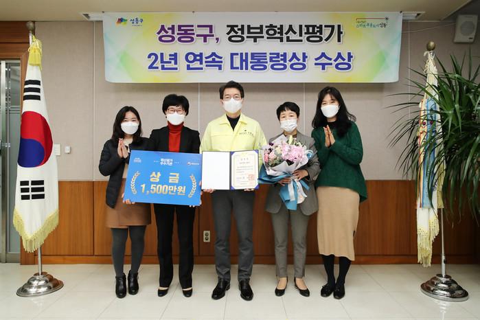 서울 성동구가 지난 21일 행정안전부 주관 ‘2019년도 정부혁신평가’ 시상식에서 최우수기관으로 선정돼 대통령상을 수상했다. 구는 ‘스마트 포용도시’를 핵심정책으로 주민들이 직접 참여하는 혁신적인 행정과 여러 기관으로 확산 가능한 혁신사례로 탁월한 평가를 받았다. 사진은 시상식에서 정원오 구청장(가운데)과 직원들이 기념촬영을 하는 모습. (사진제공=성동구청)