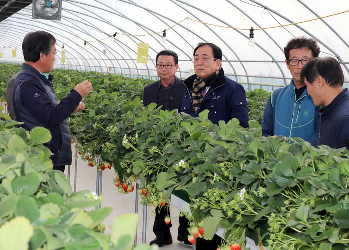 전남 영광군은 최근 딸기 재배 농가를 방문해 종사자들에게 '영광 딸기의 품질 향상을 위해 힘써달라'고 당부하고, 겨울철 환경에 따라 문제가 되는 병해충을 파악하며 해결방법에 대해 함께 논의했다. 사진은 김준성 군수가 관계자들과 이야기를 나누는 모습. (사진제공=영광군청)