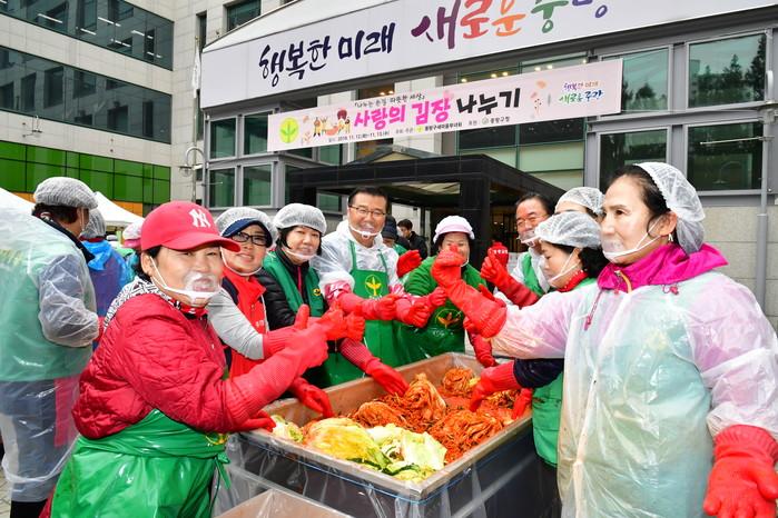 서울 중랑구 새마을부녀회가 지난 12~13일 양일간 구청 중앙광장에서 새마을부녀회원과 새마을협의회원 등 약 200명이 참석한 가운데 어려운 이웃을 위한 ‘사랑의 김장 나누기’ 행사를 개최했다. 사진은 행사에 참석한 류경기 구청장(가운데)이 참여자들과 김장을 하고 있는 모습. (사진제공=중랑구청)