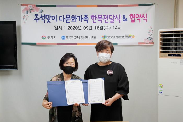 한국자유총연맹 경기 구리시지회, 구리시 건강가정·다문화가족지원센터는 16일 다문화가정의 한국생활 정착을 위한 상호 업무협약을 체결했다. 이 협약은 결혼이민자들을 다방면으로 지원하며 다문화가정이 안정적으로 정착할 수 있도록 도움을 주고자 마련됐다. 사진은 협약식에서 관계자들이 기념촬영을 하는 모습. (사진제공=구리시청)
