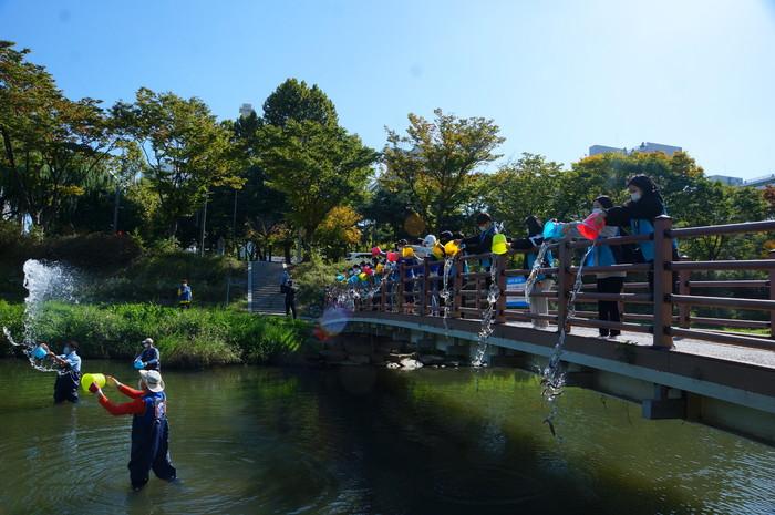 (사)바다살리기국민운동본부 안산시지부는 최근 경기 안산시와 한강수계관리위원회 후원으로 상록중학교 옆 안산천에 미꾸라지 4000여마리를 방생하고 환경정화 활동을 펼쳤다. 이 행사는 미꾸라지 습성을 이용해 하천 수질을 정화할 목적이며, 미꾸라지가 모기 애벌레를 잡아먹어 모기 감염병 예방도 기대된다. 사진은 이날 참가자들이 미꾸라지를 방생하고 있는 모습. (사진제공=안산시청)