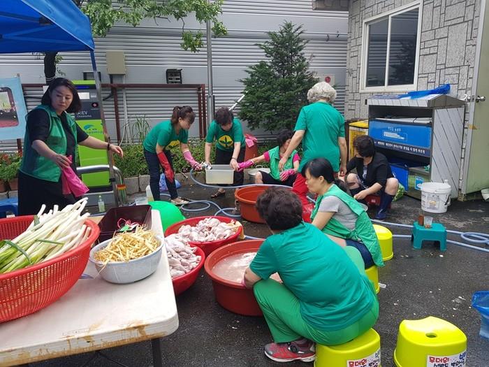 경기 의정부시 호원1동 새마을부녀회는 13일 동주민센터 앞마당에서 지역내 홀몸노인들을 초청해 ‘사랑의 삼계탕 나눔 행사’를 개최했다. 이날 회원들은 정성껏 준비한 삼계탕을 홀몸노인 100여명에게 전달했다. 사진은 닭을 손질하는 모습. (사진제공=의정부시청)