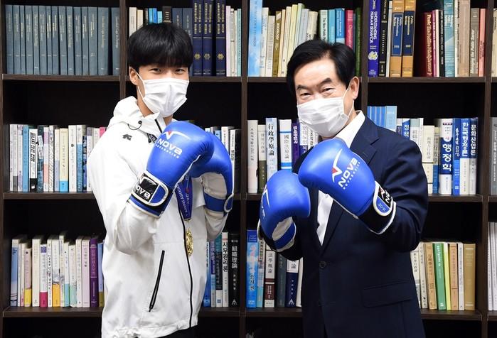 안병용 경기 의정부시장이 31일 제50회 대통령배 전국 시도복싱 대회에서 우수한 성적을 거둔 효자고등학교 3학년 전승현 선수를 격려했다. 최근 충남 청양군 청양군민체육관에서 진행된 대회에서 전 선수는 남자고등부 64㎏ 이하급에 출전해 금메달을 획득했다. 사진은 안 시장(오른쪽)이 전 선수와 복싱 포즈를 취하고 있는 모습. (사진제공=의정부시청)