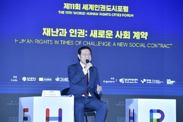 [광주=정찬남 기자] 이용섭 광주광역시장이 7일 오후 김대중컨벤션센터에서 비대면 방식으로 진행된 '제11회 세계인권도시포럼' 라운드테이블에 참석해 '재난에 맞서는 인권도시들의 새로운 역할'을 주제로 발제하고 있다.