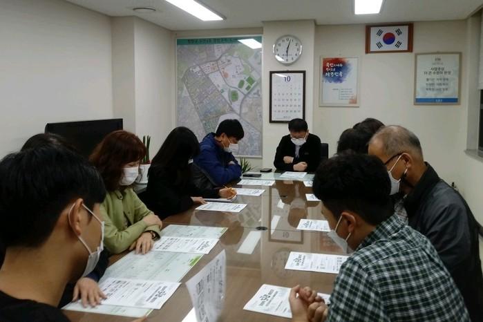 경기 수원시 팔달구 우만1동은 22일 법령 개정 등으로 올해 연말 및 2021년 연초부터 달라지는 규정과 지침을 공유하는 업무 연찬 시간을 보냈다. 사진은 우만1동 직원들이 회의를 하고 있는 모습. (사진제공=팔달구청)