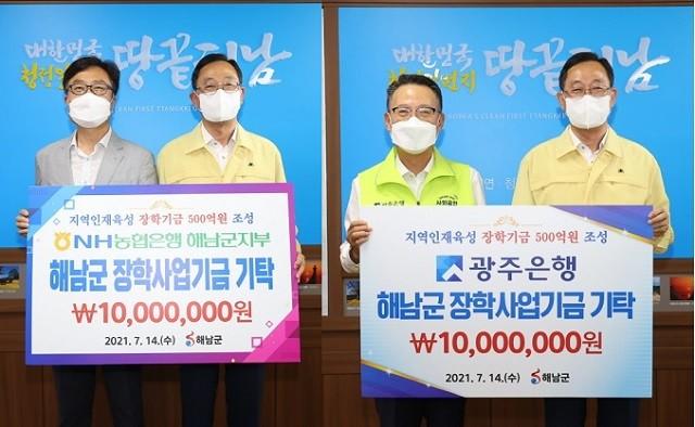 NH농협은행 해남군지부(지부장 김상보)와 광주은행(은행장 송종욱)은 지역의 인재양성과 교육발전을 위해 해남군 장학사업기금으로 각 각 1,000만 원을 해남군에 지난 14일 기탁했다.