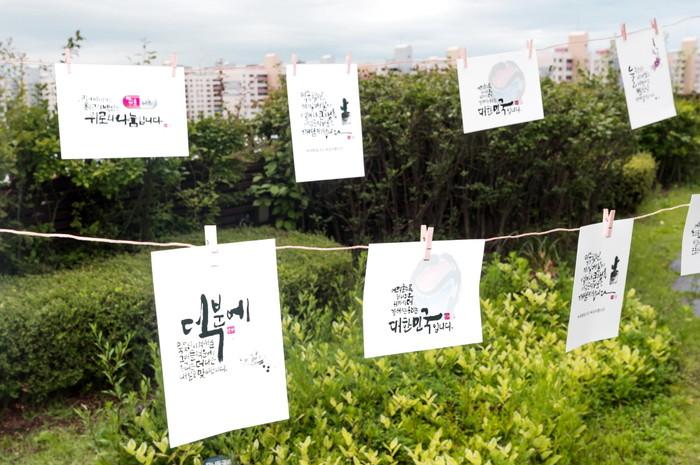 서울 양천구는 코로나19로 심적 피로를 느낄 구민들을 응원하기 위해 캘리그라피를 이용한 힐링 엽서 7종을 제작했다. 구는 이번 엽서를 통해 구청 방문객 및 구민들에게 따뜻한 위로와 응원의 메시지를 전달할 예정이다. 사진은 구청사에 전시된 응원의 메시지를 담은 엽서들. (사진제공=양천구청)