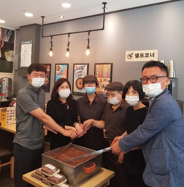 서울 서초구는 최근 저소득 취약계층의 자립을 위한 서초지역자활센터 외식사업단인 '국수나무 그린(청계산로 189)'을 문 열었다. 이 사업은 근로취약계층이 참여해 음식 만드는 기술 및 고객 응대 등의 외식 관련 전문 트레이닝을 받게 된다. 사진은 국수나무 그린의 개점식에서 시루떡을 자르고 있는 모습. (사진제공=서초구청)