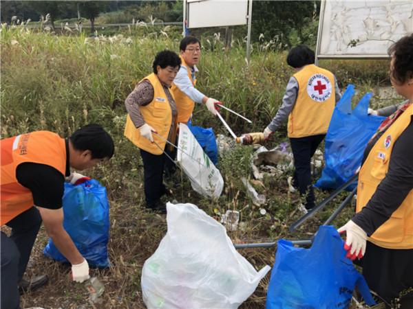 경기 여주시 금사면은 최근 아름다운 남한강을 보존하기 위한 운동의 일환으로 자원봉사센터와 적십자 나눔회 등 회원 30명이 참여한 가운데 남한강 하천변에 버려진 폐플라스틱, 빈병 등의 쓰레기 수거활동을 했다. 사진은 쓰레기를 수거하는 모습. (사진제공=여주시청)