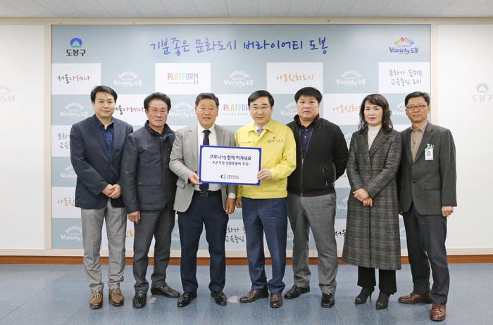 서울 도봉구는 최근 도봉구상공회로부터 코로나19 극복을 위한 조손가정 후원 성금 800만원을 전달받았다. 전달받은 성금은 지역내 8개 조손가정의 생활용품비로 지원될 예정이다. 사진은 이동진 구청장(가운데)과 관계자가 기념촬영을 하는 모습. (사진제공=도봉구청)