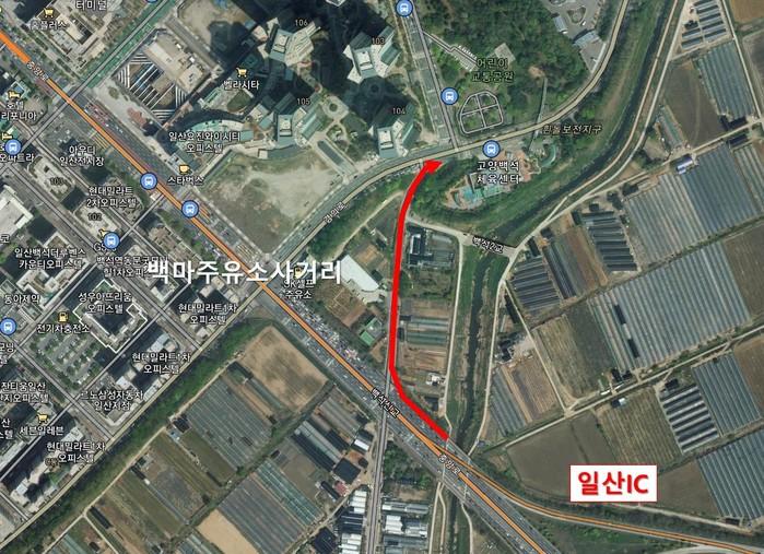 일산IC에서 나와 ‘백마주유소 사거리’에서 우회전하는 차량은 전체 차량 중 약 25%로, 이번 사업은 백마주유소사거리 전에 도로를 개설, 백석신교 하부의 호수로로 연결해 사전 분산시켜 교통 상충을 줄이기 위해 추진했다.