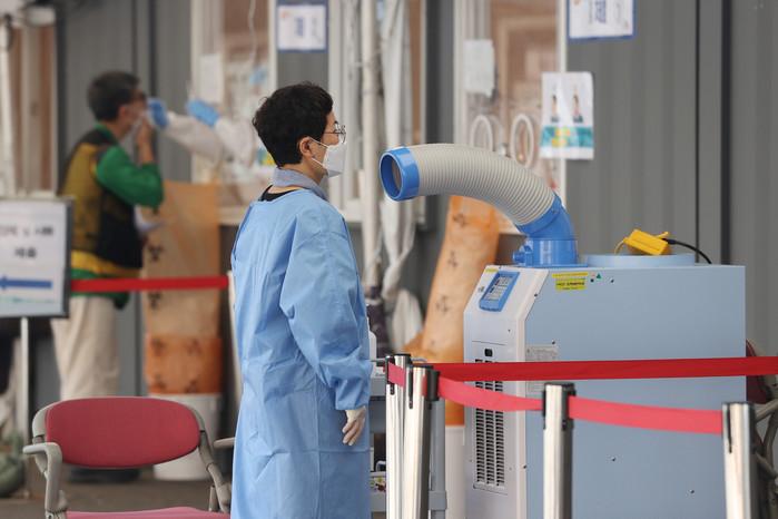 20일 오전 서울역 광장에 마련된 임시선별검사소에서 의료진이 냉풍기 바람을 쐬고 있다.