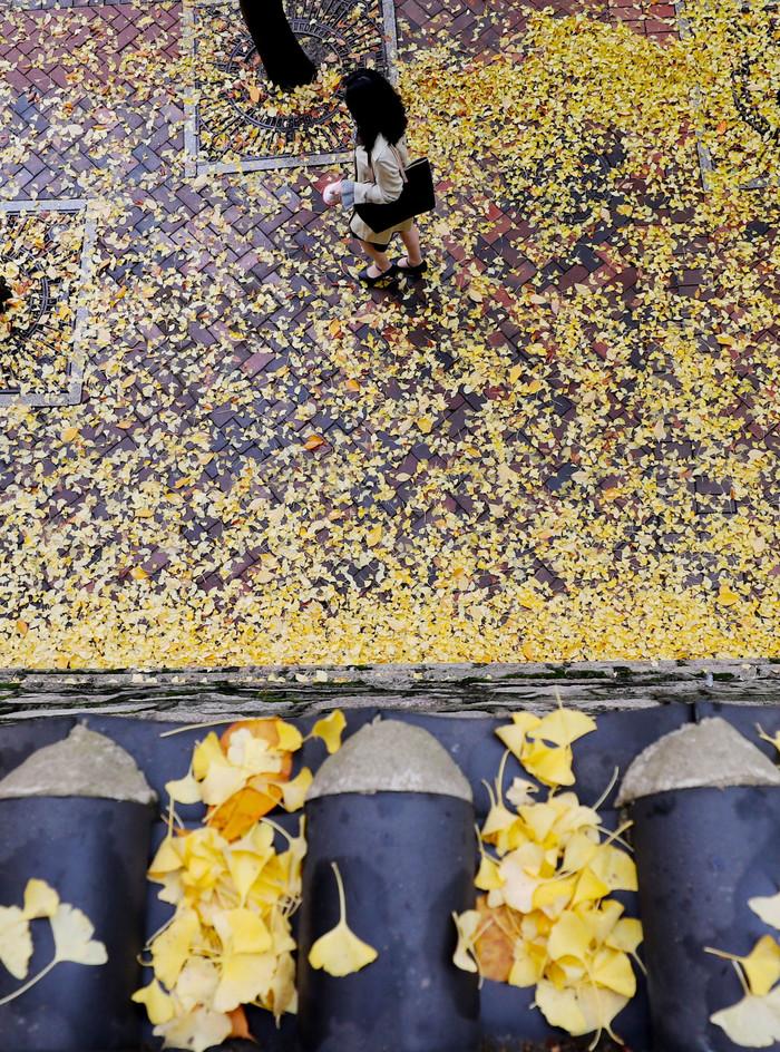 가을비가 내린 11일 오전 한 시민이 노랗게 물든 은행잎이 깔린 중구 덕수궁 돌담길을 걷고 있다.