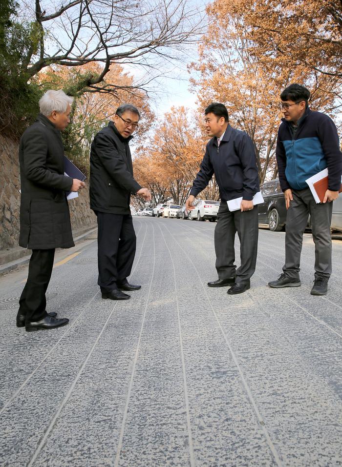 서울 서대문구가 4일 서영관 부구청장 및 관련 직원들이 참석한 가운데 겨울철 강설에 따른 재난 및 안전사고 예방을 위해 지역내 제설취약지역을 점검했다. 사진은 서 부구청장(왼쪽에서 두 번째)과 직원들이 정원여중 주변에 설치된 열선을 점검하는 모습. (사진제공=서대문구청)