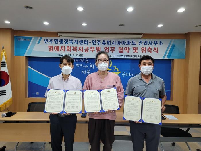 충남 아산시 인주면 행정복지센터가 최근 복지사각지대 발굴을 위한 선제적·예방적 활동을 기대하며 인주 휴먼시아아파트 주거행복지원센터와 명예 사회복지공무원 업무협약을 맺고 센터장을 비롯한 직원 13명을 명예 사회복지공무원으로 위촉했다. 사진은 이날 위촉식에서 관계자들이 기념촬영을 하는 모습. (사진제공=아산시청)