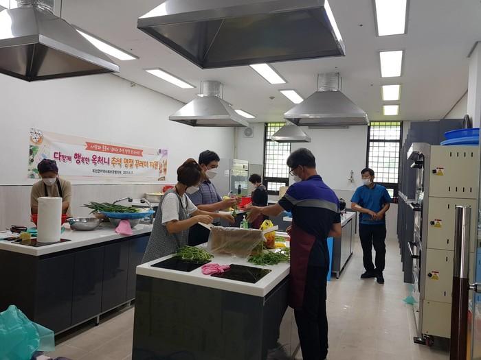 경기 양평군 옥천면 지역사회보장협의체는 최근 이틀간 지역내 취약계층 100가구에 직접 조리한 동태전 등 음식과 잡곡세트 등으로 구성한 추석 명절 꾸러미를 대상 가구에 직접 방문해 전달하는 ‘다(함께)행(복한)옥처니 추석 명절 꾸러미 지원 사업’을 추진했다. 사진은 협의체 위원들이 동태전·녹두전 등을 만들고 있는 모습. (사진제공=양평군청)