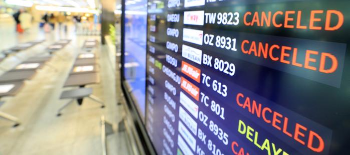30일 오전 제주국제공항 도착장 전광판에 다수 도착편의 결항과 지연을 알리는 문구가 떠 있다.
