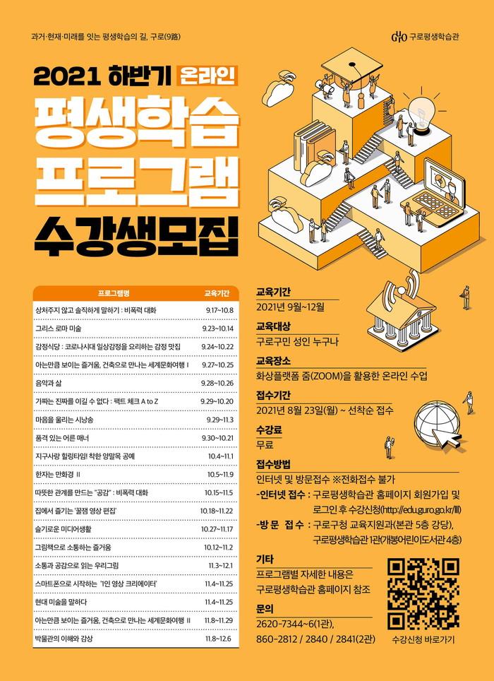 [시민일보 = 이대우 기자] 서울 구로구(구청장 이성)가 오는 9월17일~12월6일 하반기 평생교육 프로그램 수강생을 모집한다.