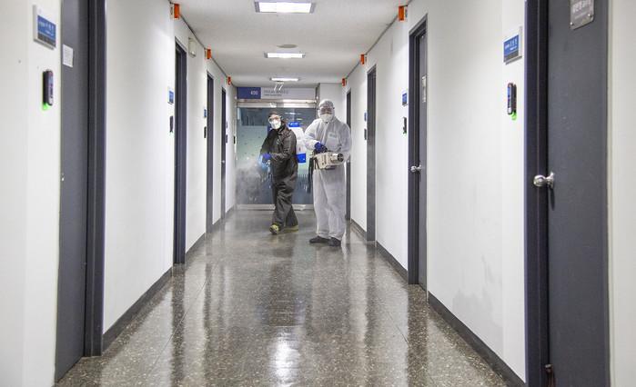 용산구가 지역내 숙명여자대학교 대면수업에 앞서 최근 캠퍼스 방역작업을 지원했다. 이날 전문 방역업체 요원 4명은 캠퍼스내 기숙사, 강의실, 식당, 화장실 등 건물 33개동에 대한 소독을 했다. 사진은 소독작업을 하는 업체 관계자들의 모습. (사진제공=용산구청)