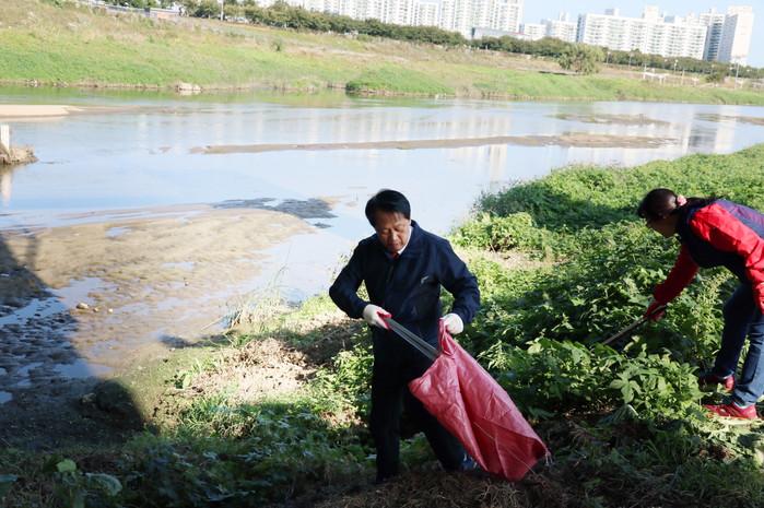 최근 서울 구로구가 구로의제21실천단원, 지역주민 등 100여명과 함께 ‘안양천 주변 정화활동’을 실시해 고척교~신정교의 구간을 집중적으로 돌며, 주민편의시설·산책로와 둔치·교량 인근의 각종 쓰레기를 수거했다. 사진은 쓰레기를 줍고 있는 이성 구청장(가운데)의 모습. (사진제공=구로구청)