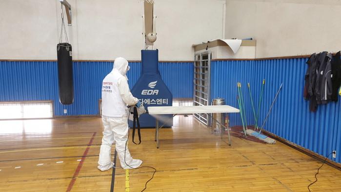 ▲ 군 관계자가 지역내 고등학교 체육관을 분무소독하고 있다. (사진제공=진도군청) |