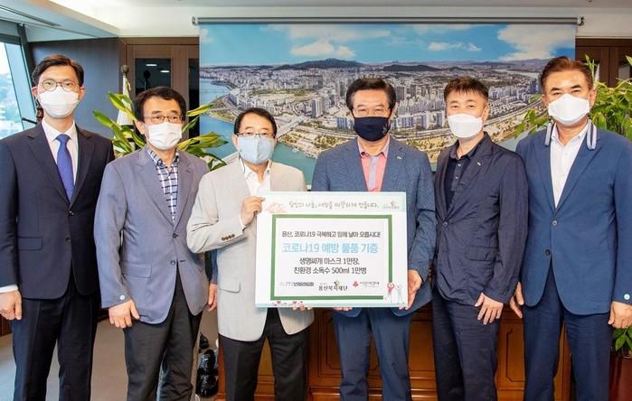 서울 용산구에 소재한 보광중앙교회가 27일 용산복지재단에 코로나19 방역물품 1만 세트를 기부했다. 재단은 물품을 보광동 주민센터로 전달했으며, 센터가 이를 지역 저소득 주민에게 배부할 예정이다. 사진은 이날 전달식에 참석한 성장현 구청장(오른쪽 세 번째)과 관계자들이 기념촬영을 하는 모습. (사진제공=용산구청)