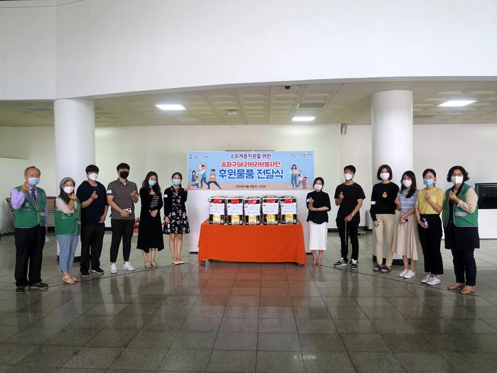 서울 송파구자원봉사센터 소속 SK러브러브봉사단이 시즌 28승으로 적립한 1120kg 쌀 중에서 50%인 560kg을 지역내 홀몸노인 56가정에 전달했다. 사진은 쌀 전달식에 참석한 SK러브러브봉사단이 기념촬영을 하고 있는 모습. (사진제공=송파구청)