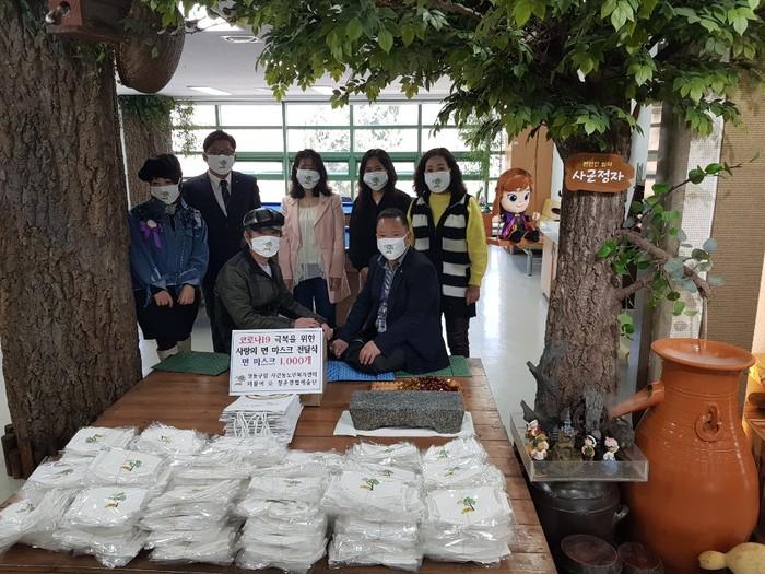 서울 성동구 사근동 노인복지센터 ‘더불어 樂 청춘클럽예술단’ 단원들이 최근 코로나19 감염 예방을 위해 면 마스크 1500장을 직접 제작한 후 구청에 전달했다. 마스크는 지역내 동주민센터 등에 전달됐다. 사진은 단원들이 기념촬영을 하는 모습. (사진제공=성동구청)