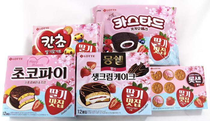 ‘초코파이 스트로베리&치즈’는 진한 치즈맛이 나는 파이 속에 딸기 쿠키칩을 넣어 씹히는 재미가 느낄 수 있고 딸기맛 마시멜로가 들어가 있다. ‘칸쵸 딸기요거트’는 비스킷 속에 딸기요거트 크림이 들어가 있다.