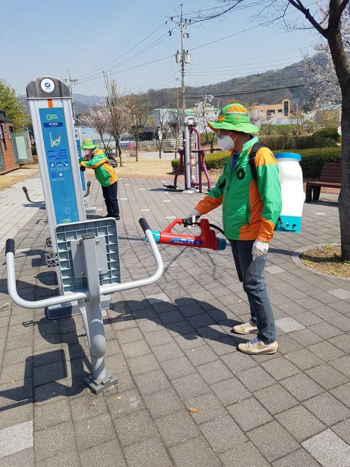 경기 하남시 지역자율방재단이 코로나19 확산 방지를 위해 최근 지역내 체육공원 및 공중화장실 등 다중이용시설 7곳을 집중 방역소독하고 '사회적 거리두기'를 홍보하는 길거리 캠페인을 전개했다. 사진은 단원들이 체육공원을 소독하는 모습. (사진제공=하남시청)