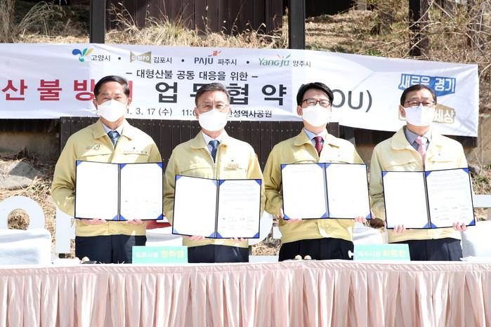 [고양=이기홍 기자] 좌측 이재준 고양시장을 비롯하여 정하영 김포시장·최종환 파주시장·이성호 양주시장이 17일 대형 산불 공동대응을 위한 ‘산불방지 업무협약’을 체결하였다.