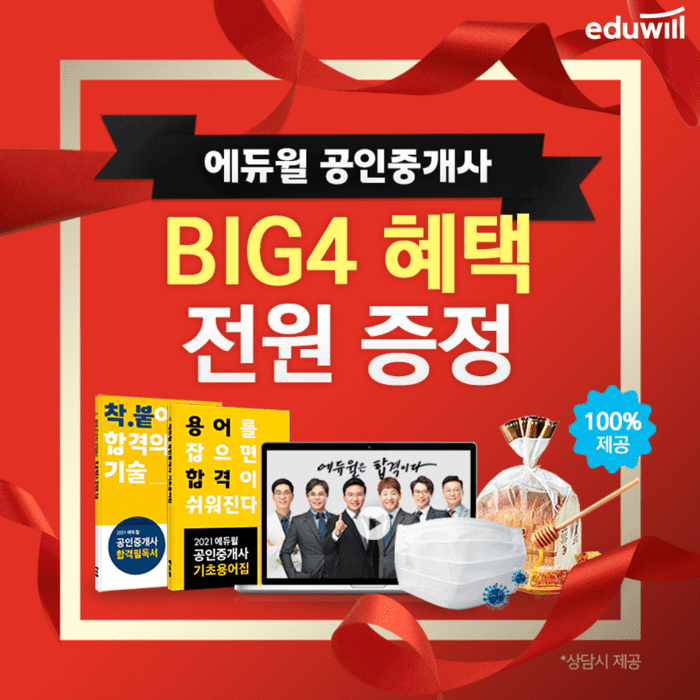 또, 온라인서점 예스24 공인중개사 수험서 부문에서 베스트셀러 1위를 차지한 에듀윌 공인중개사 교재 전 권이 포함돼 있다. 에듀윌 공인중개사 전문 교수진의 합격 노하우가 담겨있는 ‘2021 공인중개사 시크릿노트’도 받아볼 수 있다.